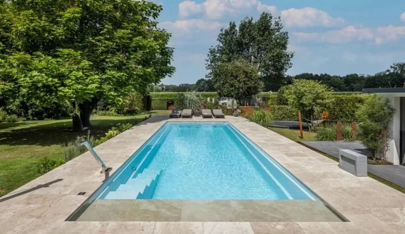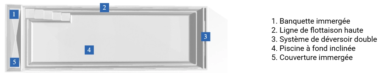 Piscine contemporaine au fond incliné avec une ligne de flottaison haute et unique. La couverture automatique traditionnellement placée tout au bout de la piscine se situe à l’avant.