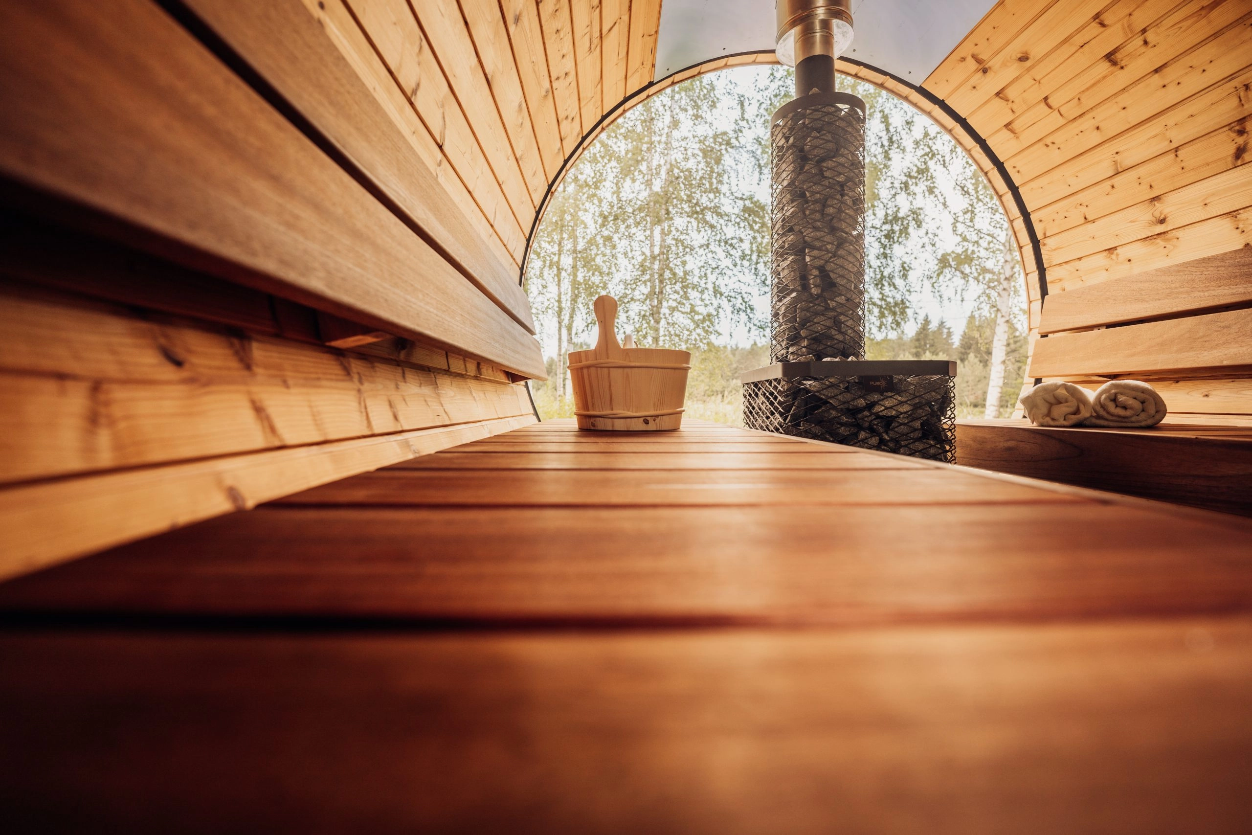 poêle à bois Puro. Le sauna a une longueur intérieure de 2,2 mètres et peut accueillir